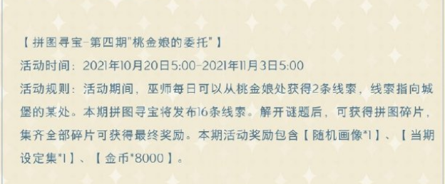 1.哈利波特魔法觉醒桃金娘的委托活动就是第四期的拼图寻宝活动,玩家可以在10.20-11.03日之间参与这个活动,还是和之前的活动玩法是一样的,玩家通过线索解开谜题,最终找到拼图碎片;
