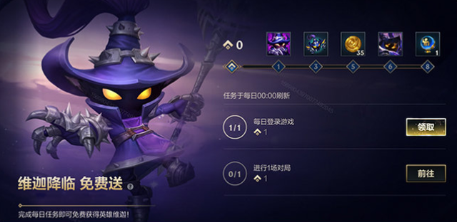对于每天上线的召唤师们来说,这个任务也是很简单。10月21日-10月27日期间,召唤师完成每日登录、对局任务,即可免费获得英雄“维迦”、头像“人小鬼大“,表情”放弃吧“,以及魄罗币*35,维迦降临姿态精选宝箱。