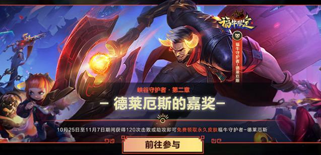 峡谷守护者第二章活动将会在10月25日-11月7日期间开启,召唤师只需完成120次击败/助攻,就能够免费领取永久皮肤福牛守护者—德莱厄斯。