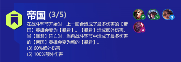 在战斗开始时,上一场造成最多伤害的帝国单位会被选择为帝王。当帝王死亡时,这场战斗中造成伤害最高的帝国棋子会被选为新的帝王。