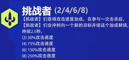 挑战者:挑战者们获得攻速加成,参与一次击杀后,会冲向新目标,并使这个攻速加成翻倍持续2.5秒。
