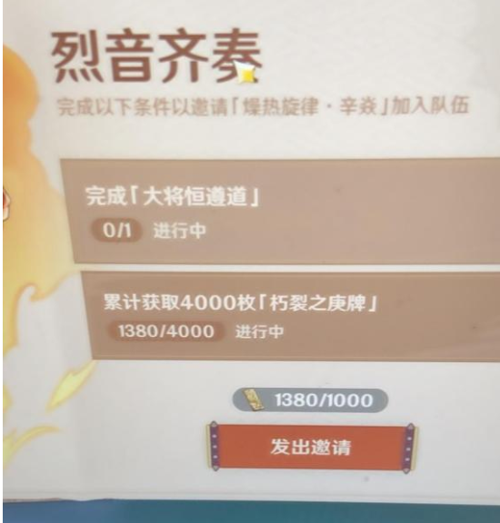 2.而本次的奖励也非常丰富哦,完成的大将恒遵道任务,并在这个任务中试炼中累计获取4000枚朽裂之庚牌后就可以花费1000个朽裂之庚牌邀请燥热旋律辛焱(火)加入队伍(仅可邀请1次)