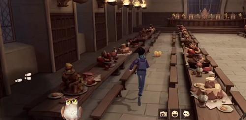 在餐桌之间的过道中行走,会看到地面上有一个南瓜,拾取这个南瓜就能触发“魁地奇”比赛,也就是所谓的保护南瓜玩法,需要带着南瓜躲避中途的干扰抵达终点!