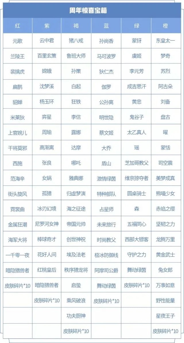 惊喜宝箱分成六个颜色,每个颜色开出的皮肤和英雄奖励都不一样,价值最高的是褐色宝箱;