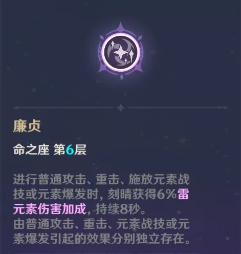 由于刻晴爆发涉及到元素战技、元素爆发、普攻和重击,因此一般能够获得4层六命效果,共24%的雷元素伤害加成,对最终伤害提升在15%。刻晴命座里提升最大的命座。