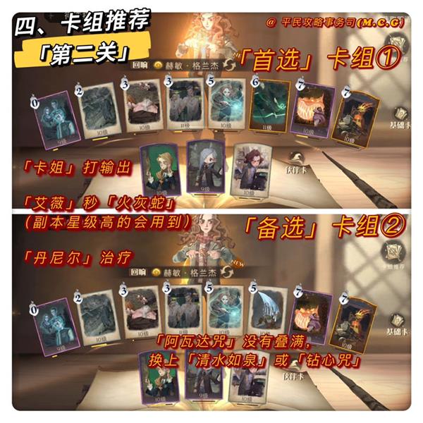 第二关一套「首选」卡组,一套「备选」卡组!如果「第一关」没有叠满阿瓦达层数,则换上「清水如泉」或「钻心咒」;