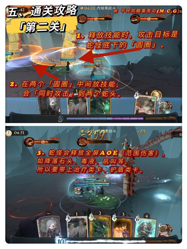 ①「如尼纹蛇」每一头为独立的个体,「有三条命」,要分别进行击败,并且会释放全屏的AOE(大范围伤害):降落石头、吼叫、喷洒毒液等!所以,建议带上治疗类、护盾类的咒语卡;