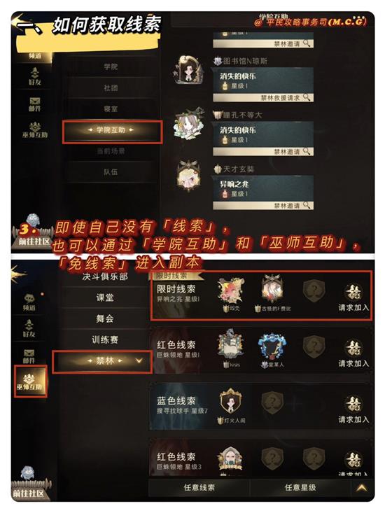 3. 即使没有自己没有「线索」,也可以通过「学院互助」和「巫师互助」,「免线索」进入副本