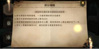 右上角的课堂积分可以通过上课来获得——魔咒课教室,黑魔法防御课堂,魔法史教室都可以,进入这些课堂之后,右下角会有完成课堂任务可以获得课堂积分的提示!参加课堂的难度越高,一次性获得的积分也越多!每日可获得的积分上限为200,若获得的课堂积分未达到上限,则未用完的上限会储存至下一天!积分上限最高储存600,需要及时参与课堂获取积分!