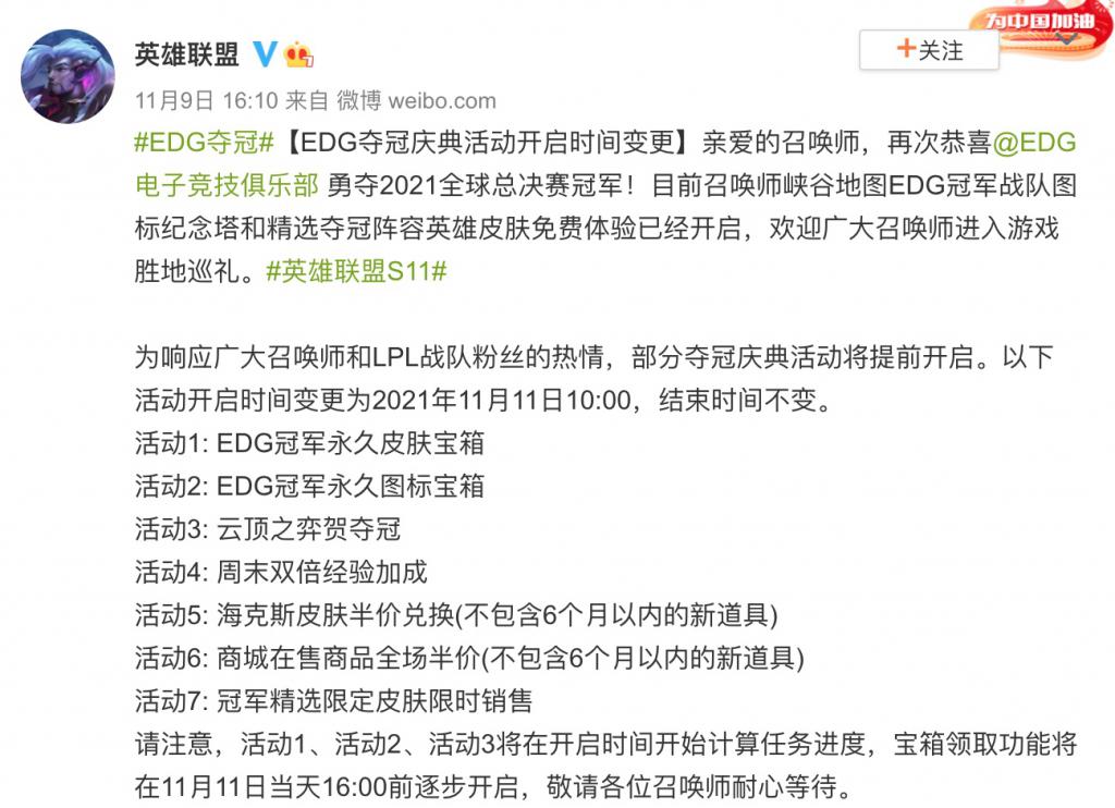 英雄联盟在2021年11月9日发布了一个微博,这个微博告诉我们接下来即将开始全新的EDG夺冠庆典活动,那么你知不知道这个EDG夺冠庆典活动什么时候开始呢?赶紧来58免费资源网看看这篇文章吧。