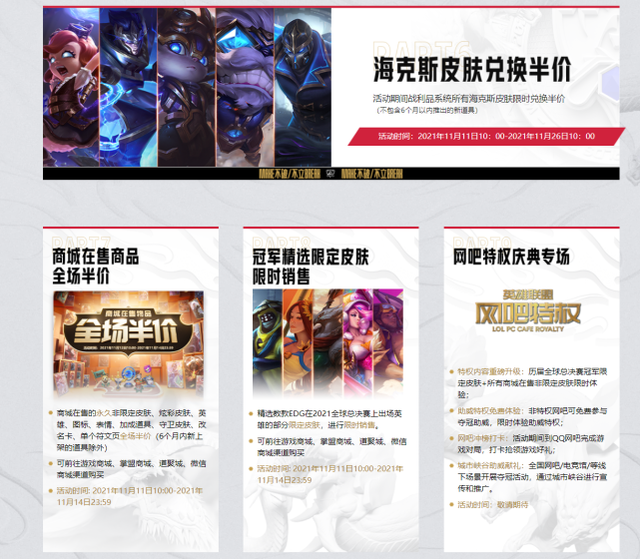 首先就是人人都可以领取的一款永久皮肤,此次永久皮肤是优先发放未拥有皮肤,只要大家在11月11日—12月12日期间都可以领取,完完整整的庆祝一个月时间!而全场皮肤半价活动则是从11日—14日一共为期三天时间,大家一定要注意时间千万不要错过!然而备受关注的就是海克斯宝石兑换半价,很多小伙伴们收集了这么长时间囤了这么久,就是要等到LPL夺得S赛冠军的半价,如今真的如愿了!不知道各位小伙伴们都准备换什么呢?