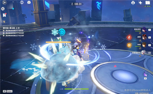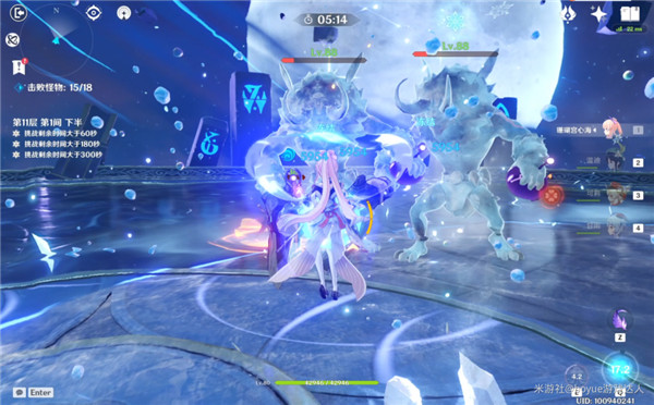 第3间:上半场是无相之水,在露出核心时火c狂暴输出,残血出小怪时使用冰属性角色击杀最快,能直接秒。