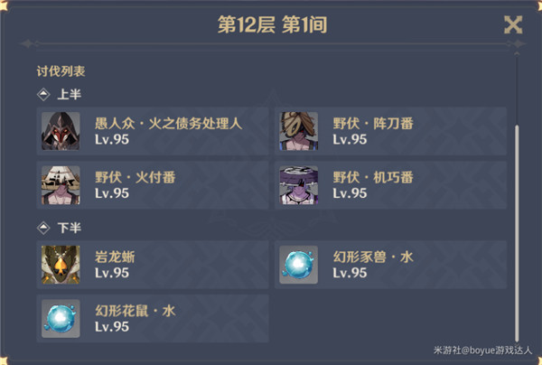 第1间:上半场17只,下半场18只,前面是3只史莱姆配2只骗骗花,最后则是深渊法师(上半场尽快破掉水法师的盾)与丘丘暴徒,这边如果有温迪或者万叶的话会很轻松。