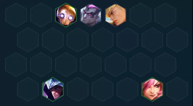 备选过渡推荐:男枪+曙光+盖伦+男刀+卡特组成4学院2刺客,比前者强度更高,6人口再上机器人开2保镖2圣盾。