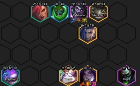 3、阵容中卡莎需要有足够的强度,阵容在卡莎来之前可以把金克斯或者厄加特作为主要输出点,蒙多作为主要抗伤害的位置。