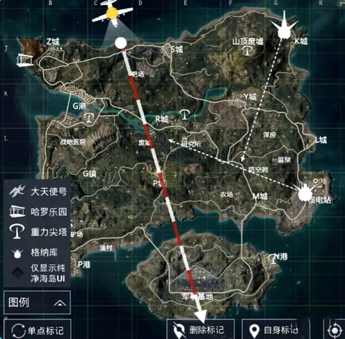格纳库在海岛地图上一共有两处,固定航线就如下图白色虚线所示!