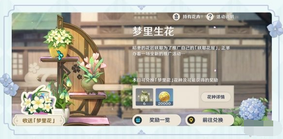 ● 「梦里生花」活动共持续十天,活动前六天,每天都可在「咲耶」处兑换「梦里花」花种。