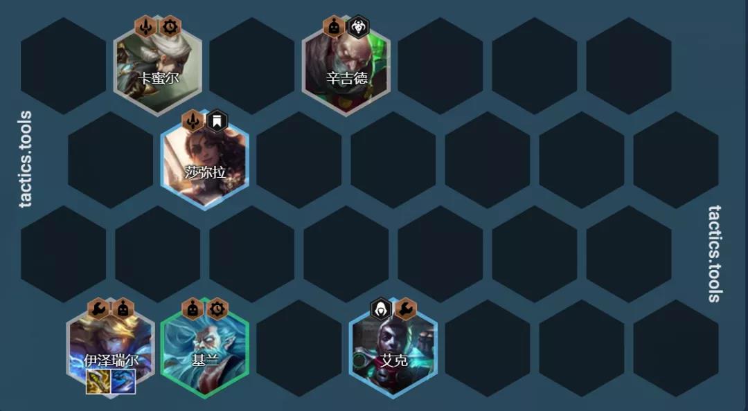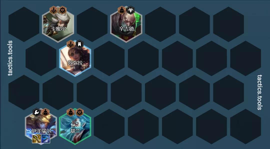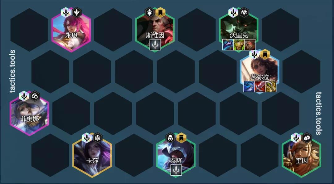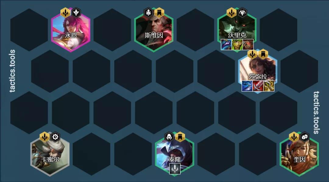 这套是一套以莎弥拉为赌狗的阵容,如果有海克斯强化和转职就可以不用拉8人口,因此小嗨还是推荐在有铲子和海克斯强化的情况下才考虑这套阵容,4挑战和6挑战对于莎弥拉的加成差距非常大。