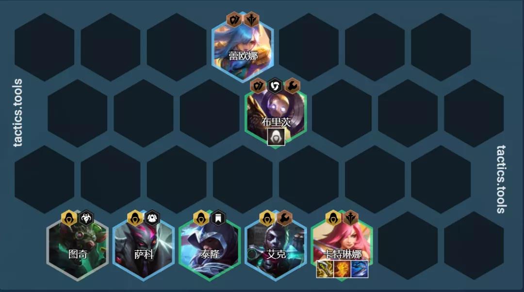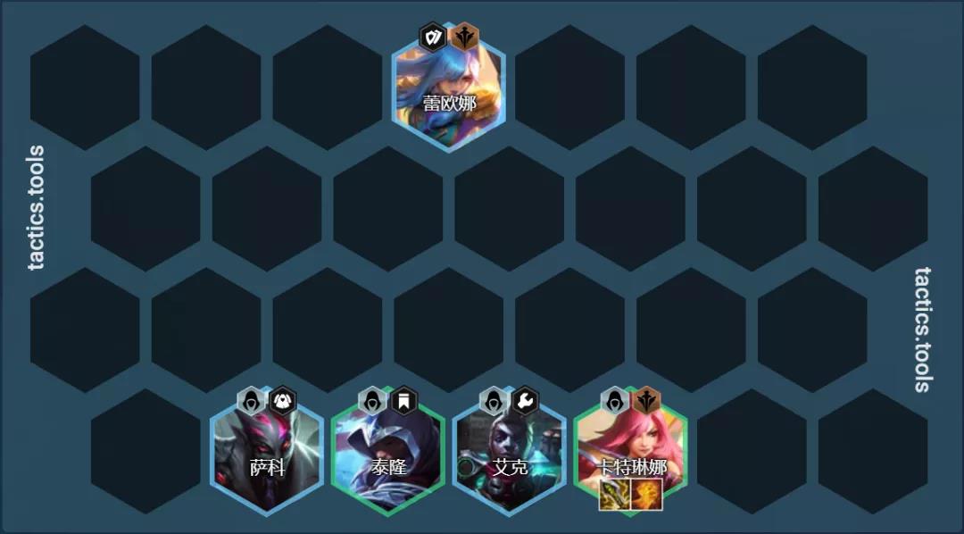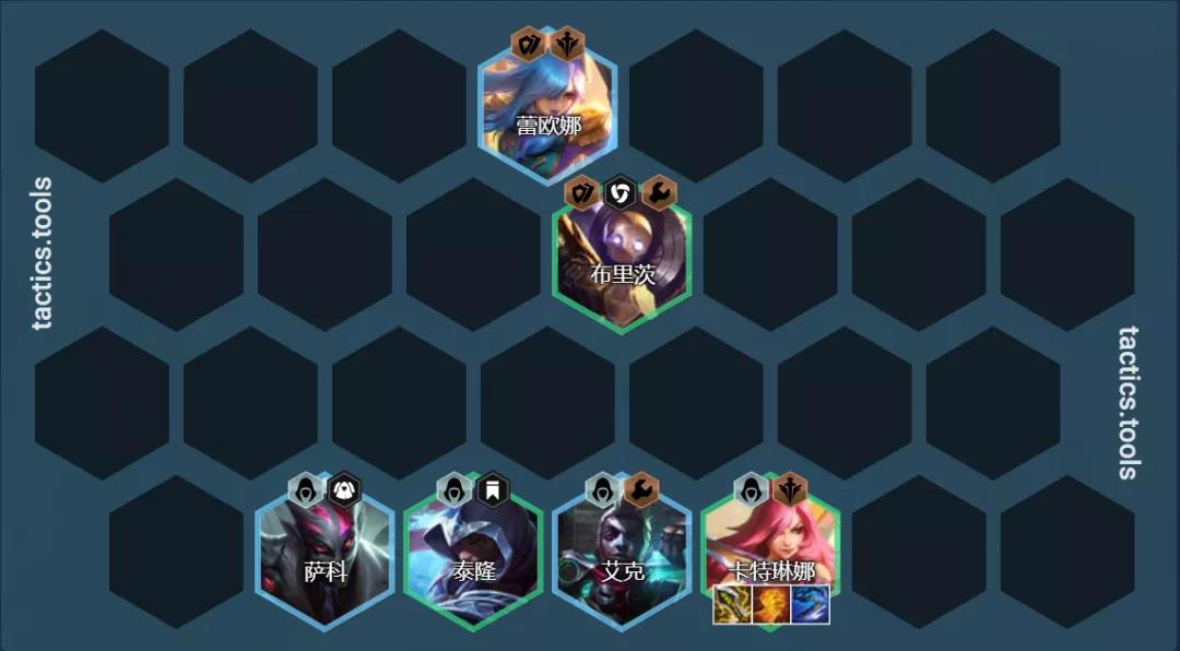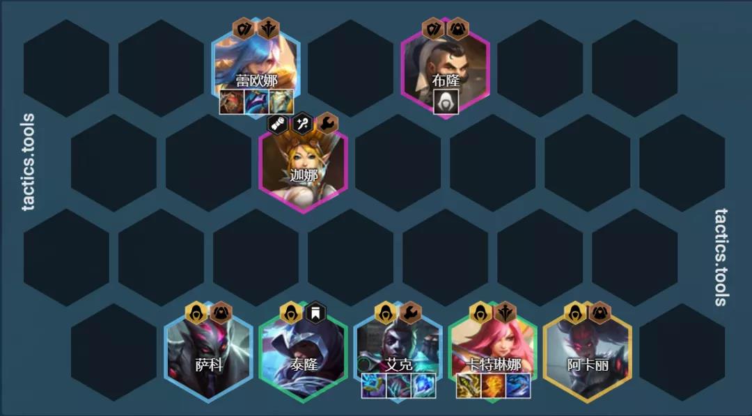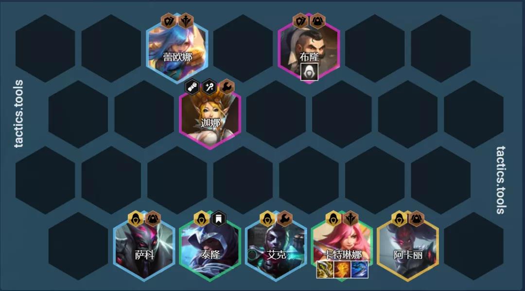 阵容组成:卡特琳娜、泰隆、艾克、萨科、蕾欧娜、布隆、迦娜、阿卡丽(需要1刺转)