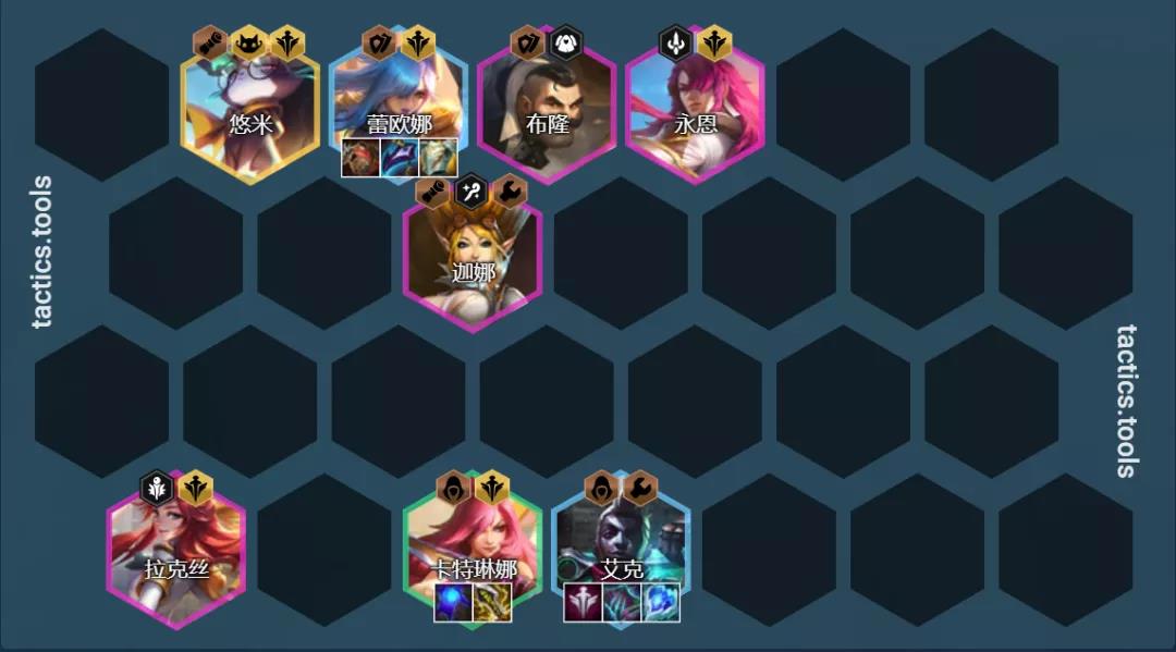 阵容组成:卡特琳娜、艾克、蕾欧娜、布隆、永恩、拉克丝、迦娜、猫咪(需1学院转)