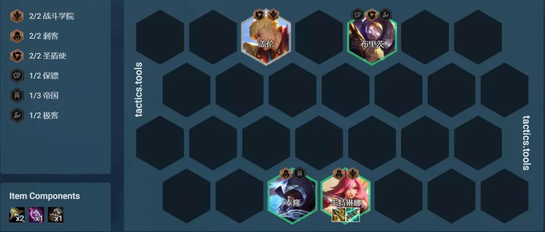 学院刺客是一套赌狗阵容,核心英雄是2费卡的卡特琳娜和3费卡的蕾欧娜,这两张卡牌一定要3星。其次在追3星的同时可以追3费卡艾克>3费卡萨科>2费卡泰隆,3星的数量越多阵容强越高,后期如果艾克没有3星可以把装备给2星阿卡使用。