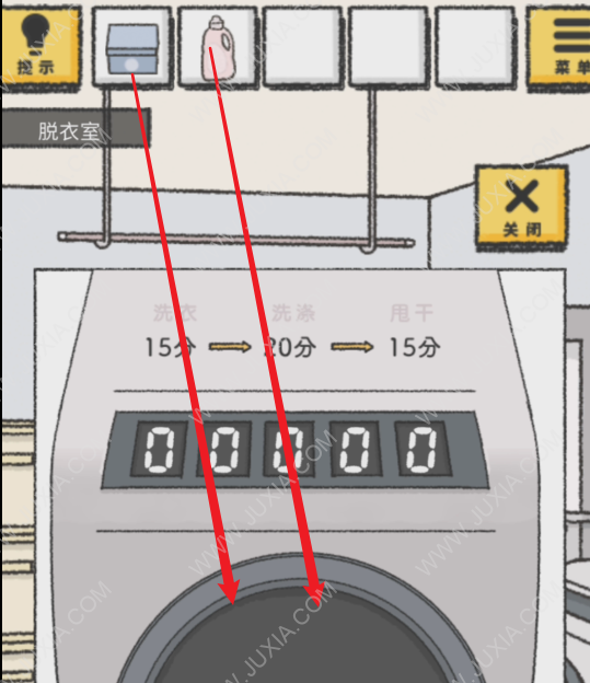 26.回到脱衣室,点击洗衣机,将洗衣机上标注需要多少时间和现在时间对照,计算出密码:45520(计算方法:洗衣需要15分钟加上现在时间的分针时间30分钟,洗衣需要定时到45,从45分开始,洗涤需要20分钟,洗涤结束后分针指向5,甩干需要15分钟,结束后分针到达20)。