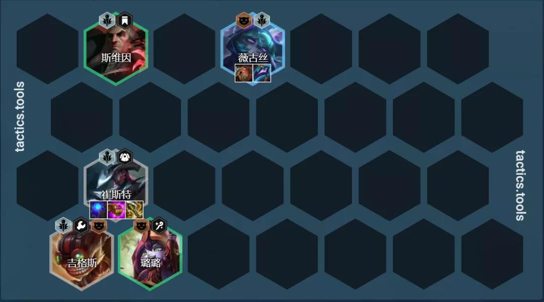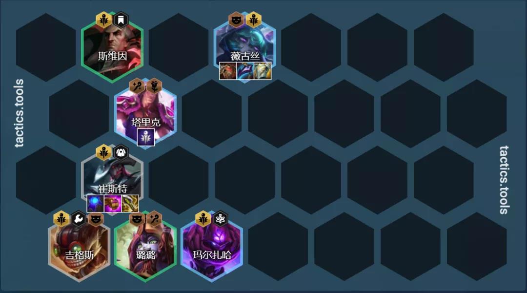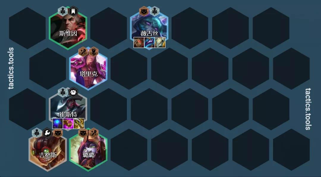 阵容组成:崔斯特、奥利安娜(璐璐3星用璐璐)、斯维因、薇古丝、塔里克、马尔扎哈/拉克丝(吉格斯3星用吉克斯)、迦娜、维克托