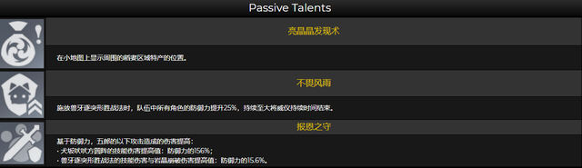 五郎的其他几个天赋技能分别是小地图区域显示稻妻特产;施放Q技能后队伍中所有角色防御力提升25%,直至大将威仪领域持续时间结束;基于自身防御力,五郎的E技能和Q技能造成伤害提升。