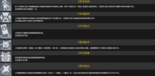 再来看一下五郎的命之座,一命时处于大将旗指物和大将威仪领域范围内的角色(除五郎自己)对敌人造成伤害时,E技能冷却时间降低2秒,该效果每10秒至多触发一次;二命时在大将威仪领域内的角色获得元素结晶产生的晶片,那大将威仪领域时间延长1秒,最多可延长3秒;三命时E技能等级提升三级;四命时大将威仪领域在具有“难破”、“摧毁”效果时,还能够为当前角色恢复生命值,回复量相当于五郎防御力的 50%;五命时Q技能等级提升三级;六命时大将威仪领域等级分别为“坚守”、“难破”、“摧毁”时,队伍中的岩元素暴击伤害分别提升10%/20%/40%。