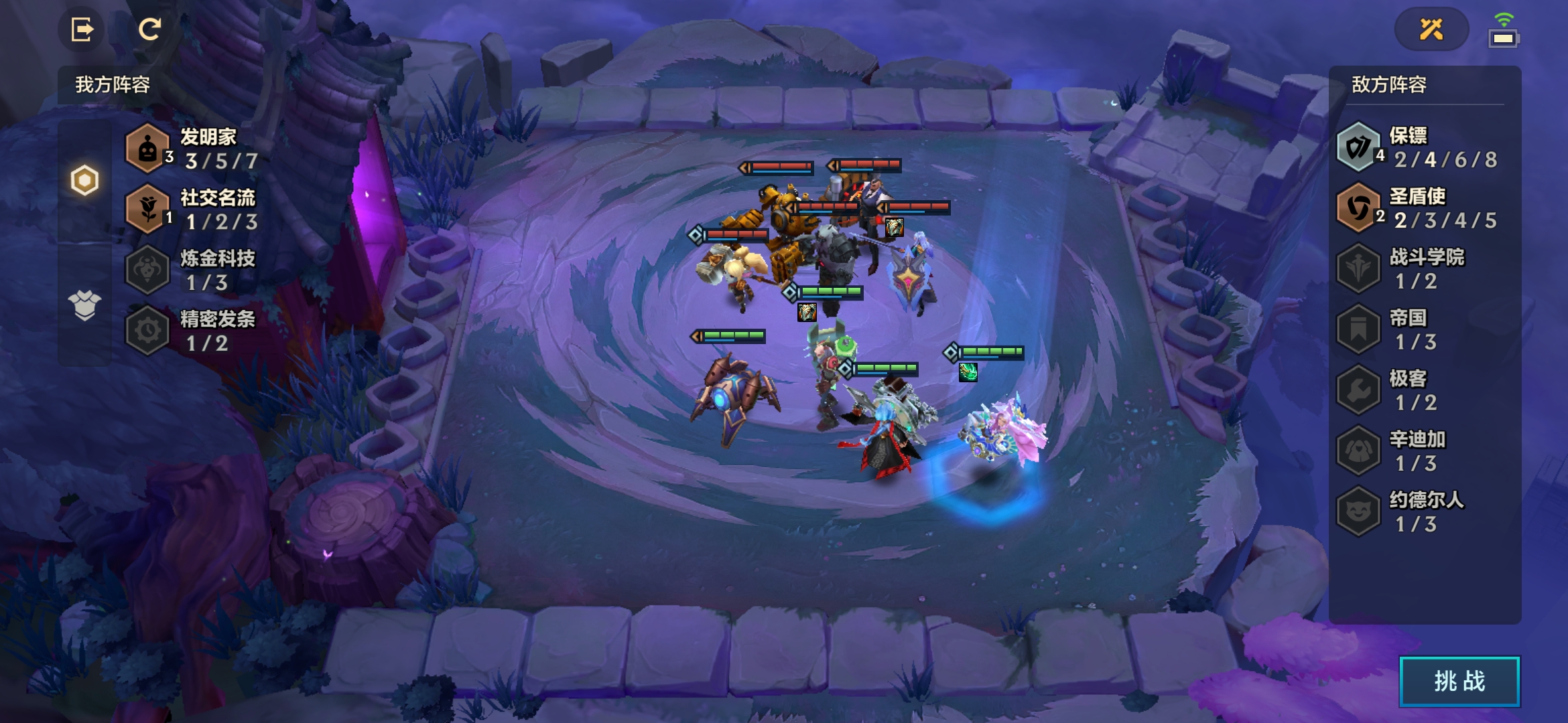 1、这一关对面羁绊为4保镖和2圣盾使,我方羁绊为3发明家和1社交名流,虽然对面羁绊很肉,但是却没伤害。
