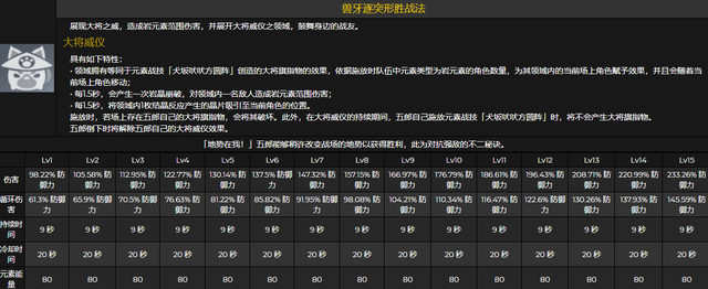 五郎的E技能为“犬坂吠吠方圆阵”,能够造成岩元素范围伤害,并立起大将旗指物,之后根据队伍中岩元素角色的数量,带来领域增益效果,一个岩元素角色,防御力提升,二个岩元素角色,额外提升抗打断能力,三个元素角色再额外获得岩元素伤害加成。不过场上只能存在一个大将旗物,该技能冷却时间10秒,持续时间10秒。如果之后未改动,意味着该技能可以一直施放。