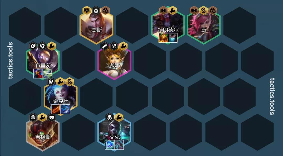 阵容组成:吉格斯、布里茨、特朗德尔(巨魔)、迦娜、艾克、蔚、金克斯、杰斯