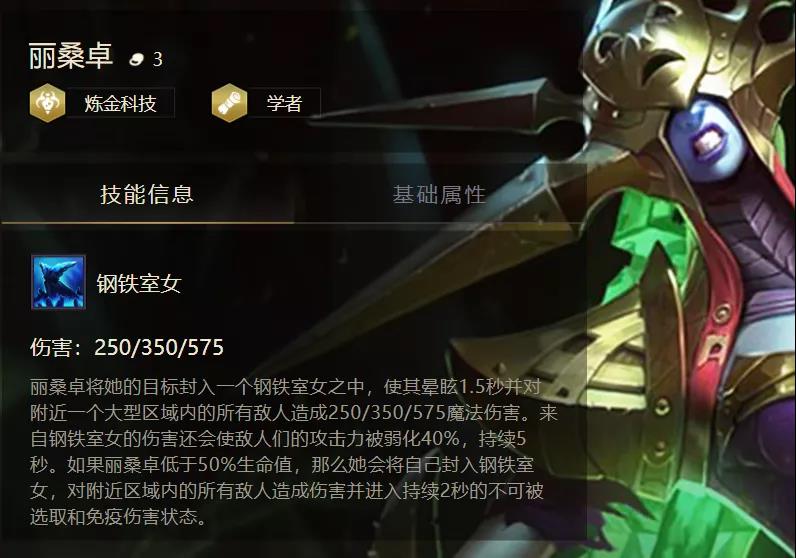 这套阵容主要依靠的就是丽桑卓(冰女),大家可以看到丽桑卓50%血量以上,3星技能伤害575魔法伤害,搭配强势法系输出装备,一个技能可秒敌方大部分棋子,如果没秒也会降低敌方棋子40%攻击力,血克普攻输出阵容;如过血量50%以下对自身消除仇恨冰封免疫伤害并对周围敌人造成高魔法伤害,如刺客之类的脆皮直接秒杀,血克刺客。