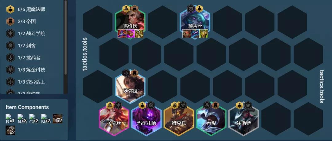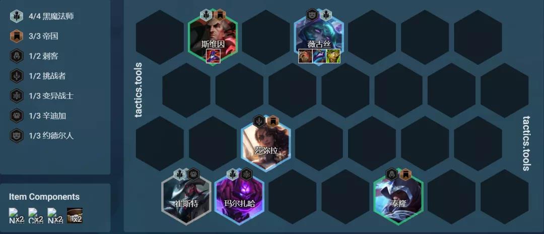 阵容组成:崔斯特、斯维因、泰隆、薇古丝、马尔扎蛤、拉克丝、莎弥拉、维克托