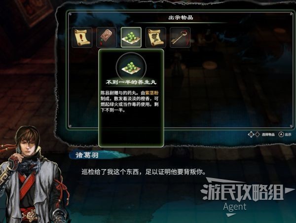 要证明巡检背叛教主时,先出示黄玉钥匙,可获得金玉钥(容易错过)。然后再出示养生丸继续剧情。