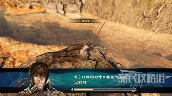 在河边的鱼池钓鱼,多钓几次,有特殊提示时迅速收杆,可钓到金子一锭。