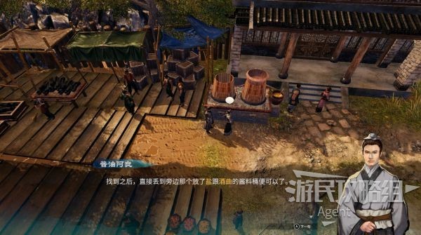 石磨旁,酱油阿良旁的酱料桶也是解谜的关键。原料拿到这里加工可得到各种物品。