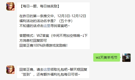 在昨日的第一条推文中,12月3日-12月12日福利活动的活动名字是?(五个字)这道题目就是王者荣耀在微信公众号上全新给大家带来的每日一题的题目,只要正确的回答出这道题目的答案就可以领取对应的奖励了,那么你知不知道这道题目的正确答案是什么呢?赶紧来58免费资源网看看本文吧。