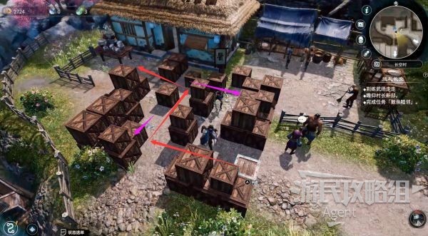 先沿紫色箭头,运劲推这两个箱子到下图位置。