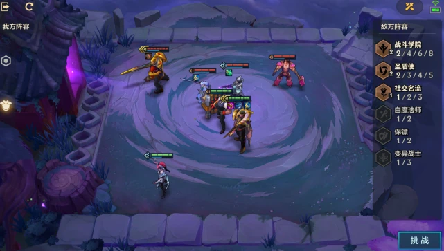 第一关敌方4枚棋子,2战斗学院2圣盾羁绊,有个三星棋子盖伦。我方是3辛迪加2保镖,同样有个三星棋子德莱厄斯,强度上差不多太多。