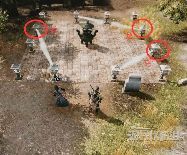 点燃灯座,每两道光线相连,共三对。按下图分别放入蛇、龙、马三块石板,谜题就解开了。