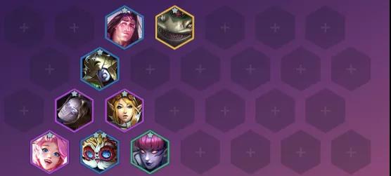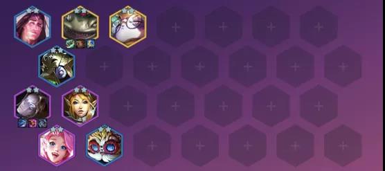 瓦洛兰之盾 塔里克(3)、大发明家 黑默丁格(3)、冰霜女巫 丽桑卓(3)、风暴之怒 迦娜(4)、发条魔灵 奥莉安娜(4)、星籁歌姬 萨勒芬妮(4)、魔法猫咪 悠米(5)、河流之王 塔姆(5)(阵容主C)