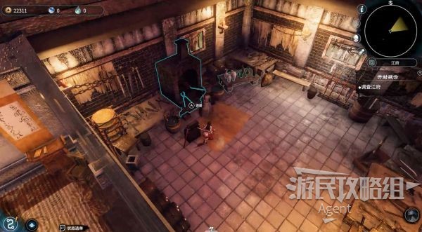 作坊里调查炉子和桌上的瓷瓶,右边酒坛处拿到仙疗丸。