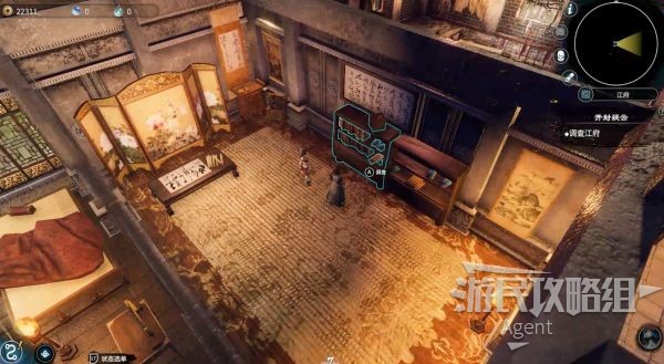 书房里调查书架,发现屏风后的暗门,进入密室调查宝物。