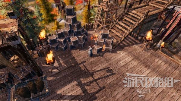 进黑火寨前,这里烧两处堆积的木箱,可拿三个宝箱(高处一个)。
