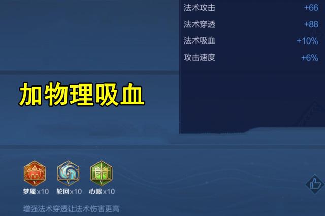 第三种方案就是带蓝色轮回,蓝色轮回可以增加法术吸血(图中打错了),如果带上了法术吸血的铭文,甄姬就不用出吸血书了,这样一来就多一个装备格子出别的装备,既能选择自保装也能让自己的法术攻击更上一层楼!