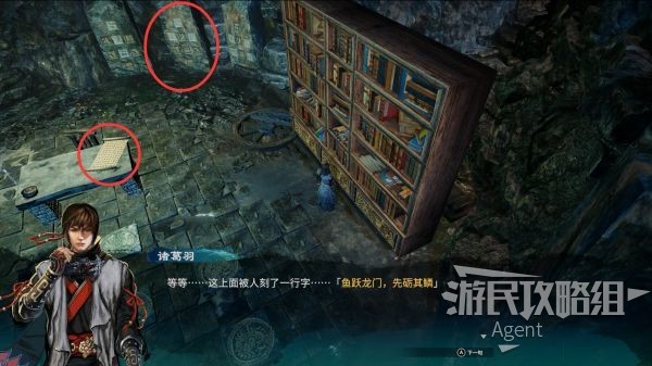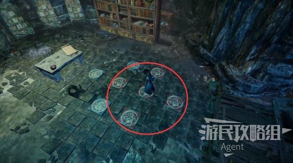 翻动下图这五个地砖,就是中间石碑的鱼鳞阵了。书架移开后,宝箱里拿到机关钥匙。