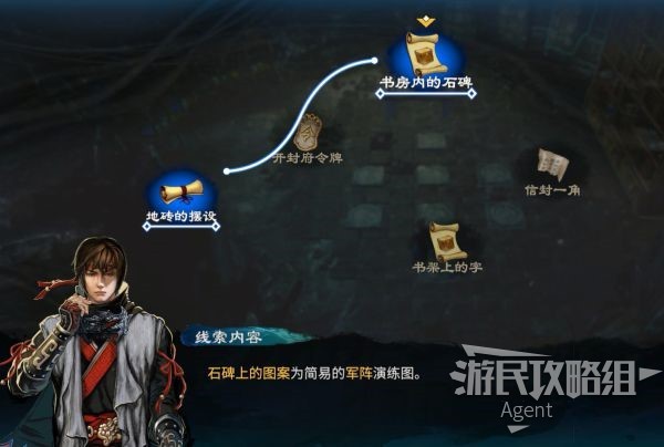 调查书架、桌上的字,得知需要排鱼鳞阵,而鱼鳞阵对应的是中间的石碑。