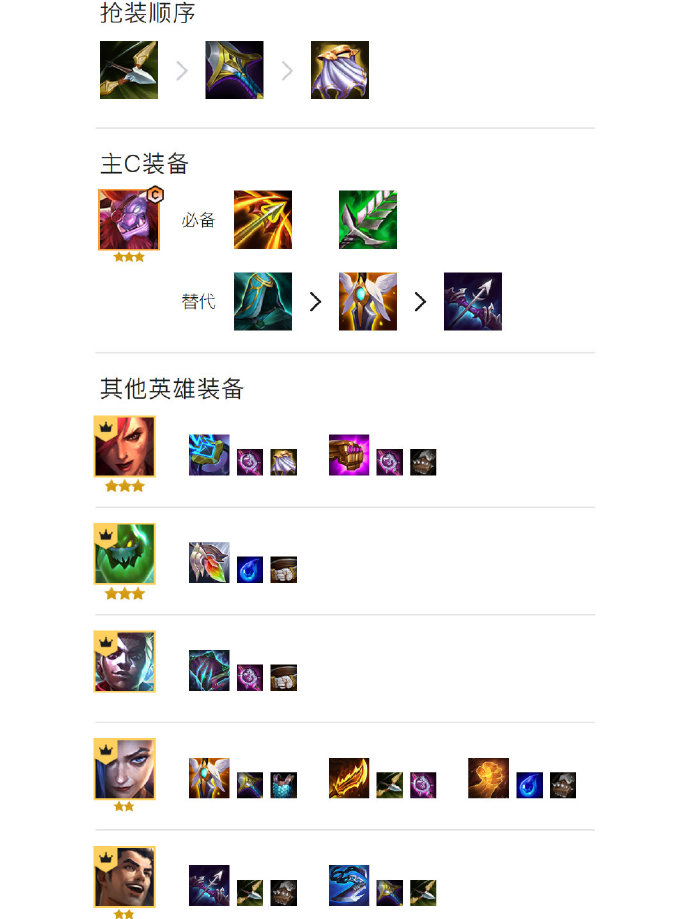 主C卡特朗德尔(巨魔)和蔚是两费卡,需要在6人口慢D三星。正常情况下3-2或者3-5阶段上6人口。慢追三星,扎克、丽桑卓(冰女)、艾克数量多也可以追三,每增加一个三星就能增加让你上分机会。高点段位的对局可以3-2升6人口搜卡,把卡的质量提升保血提节奏,靠着连胜积攒经济再慢D三星。