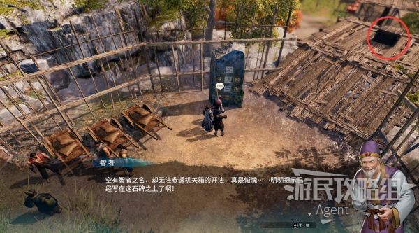 调查石碑背面得知解法“推烧烧敲敲”,然后打开机关箱。